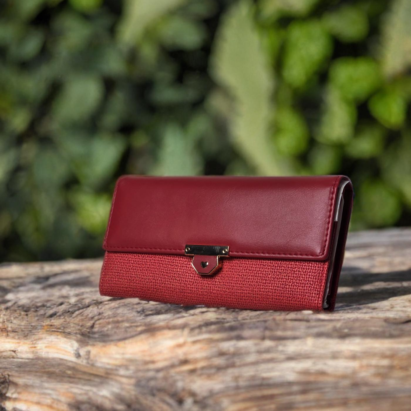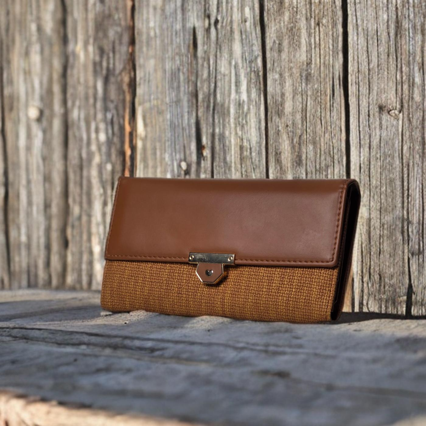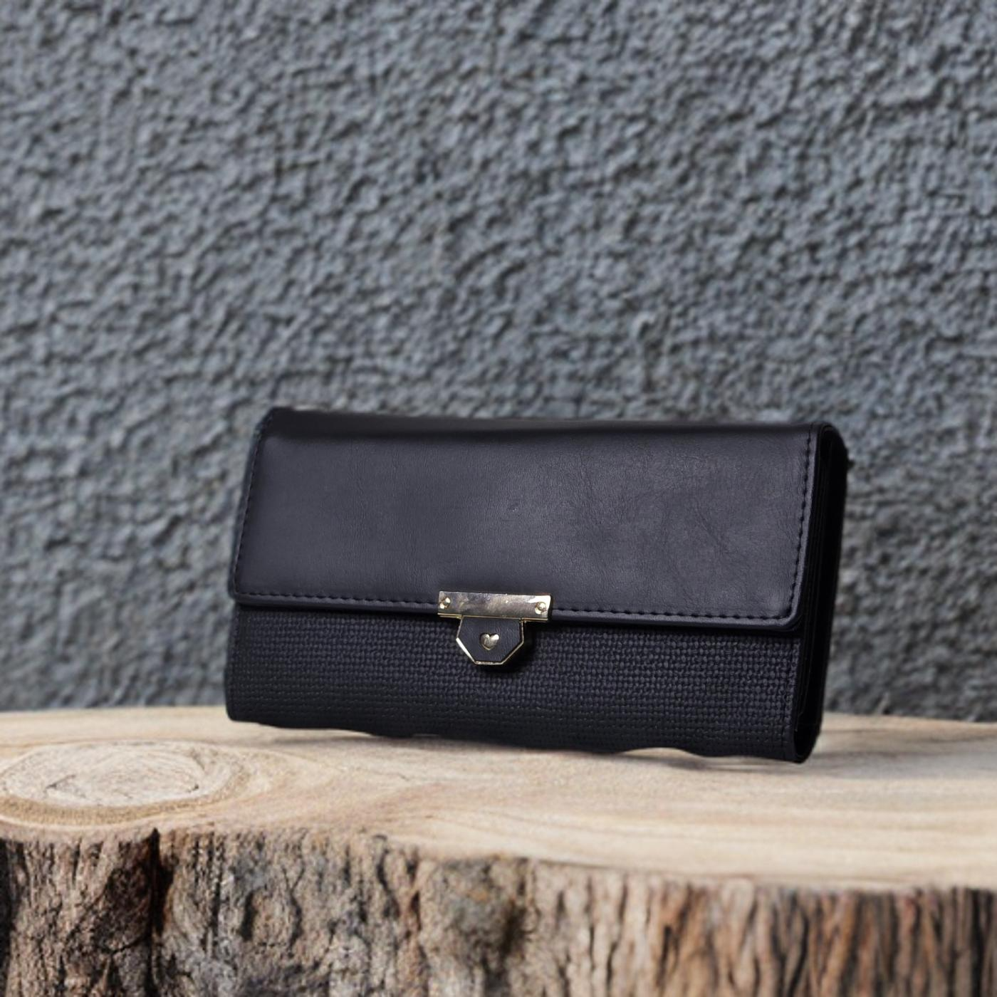 Crafted with a premium smooth faux leather flap and a distinctive woven textile body, this wallet offers a luxurious feel and a unique, stylish look. The contrasting textures are beautifully complemented by a secure, polished gold-tone metal clasp featuring a subtle heart detail.