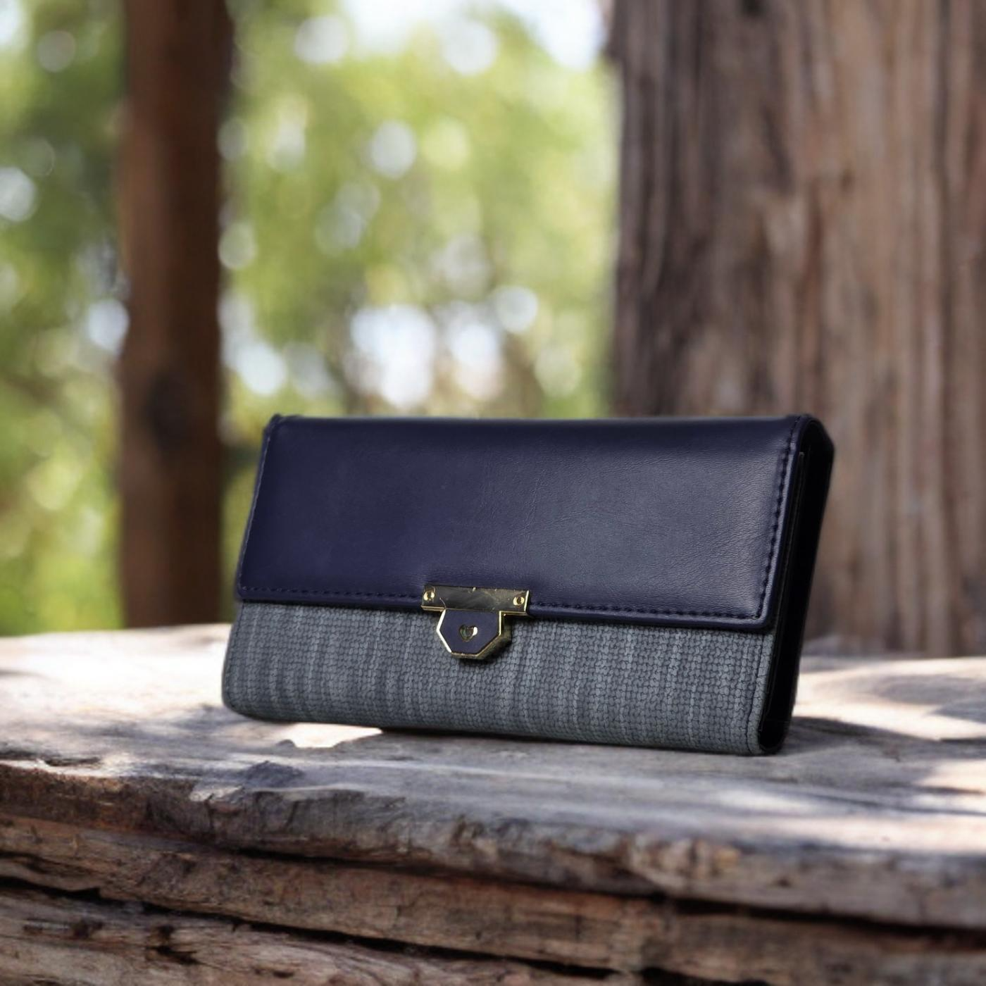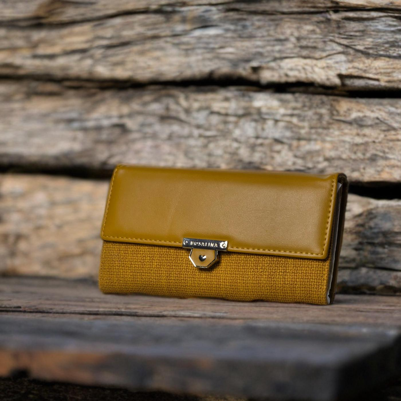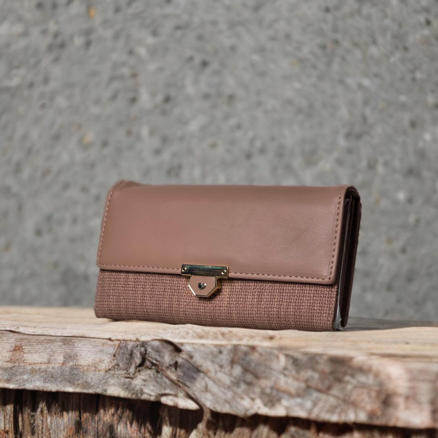 Crafted with a premium smooth faux leather flap and a distinctive woven textile body, this wallet offers a luxurious feel and a unique, stylish look. The contrasting textures are beautifully complemented by a secure, polished gold-tone metal clasp featuring a subtle heart detail.